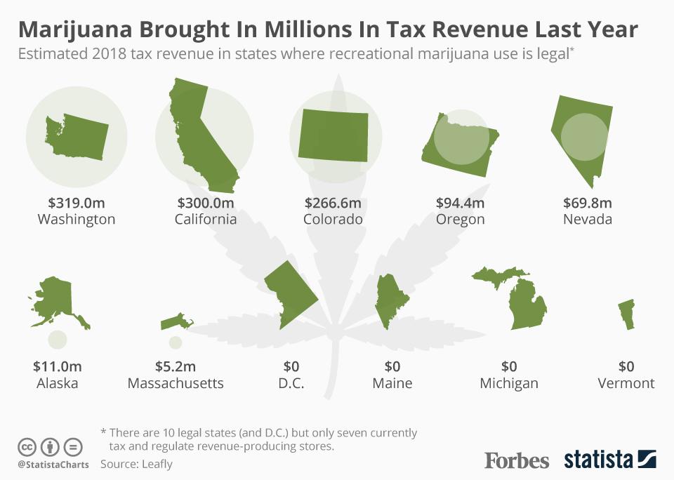 The image below shows the tax totals from 2018 for states that have legalized recreational marijuana. These numbers are only growing and the number of states legalizing recreational marijuana is growing too.