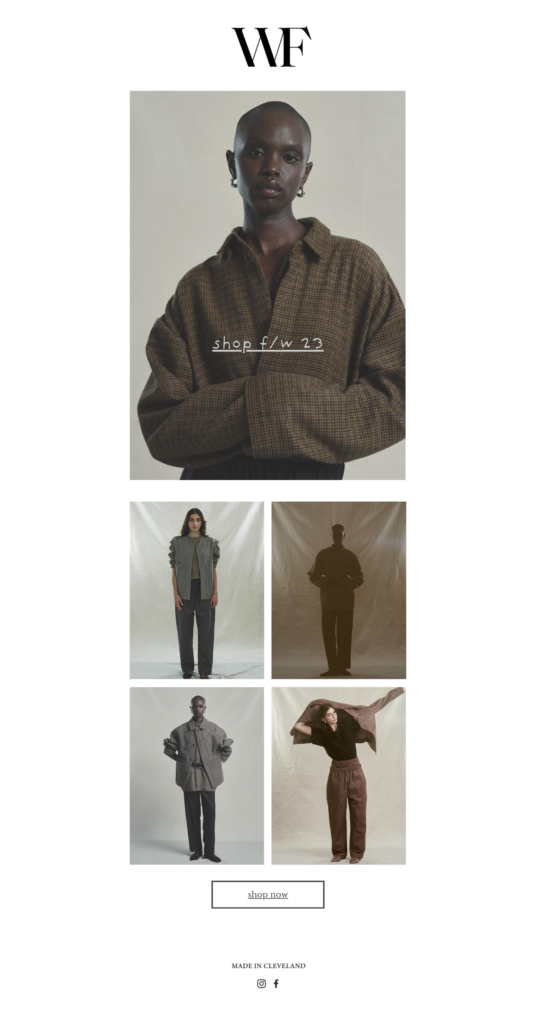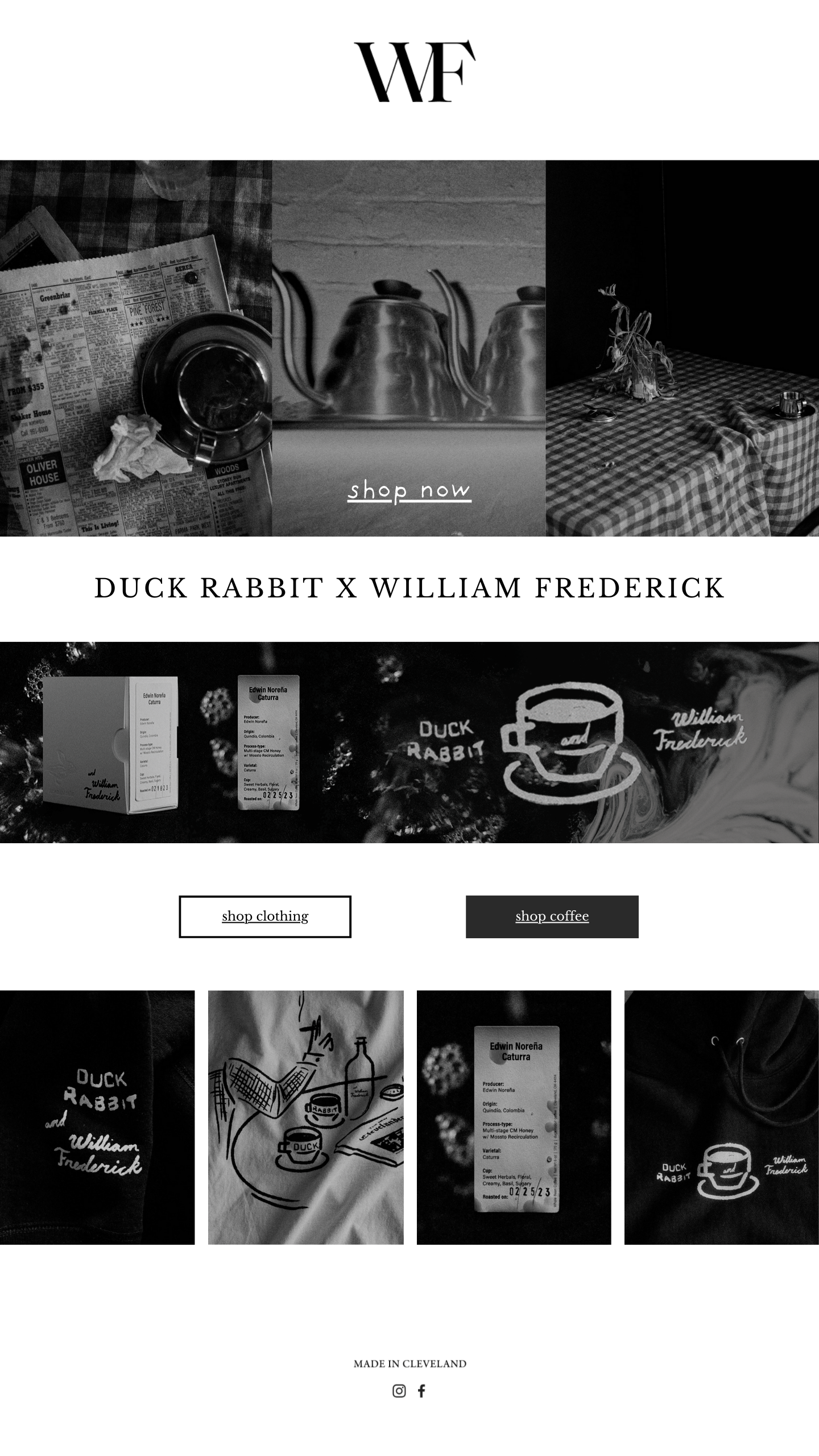 These emails feature promotion for William Frederick’s Fall/Winter 2023 collection and their collaboration with Duck Rabbit coffee.