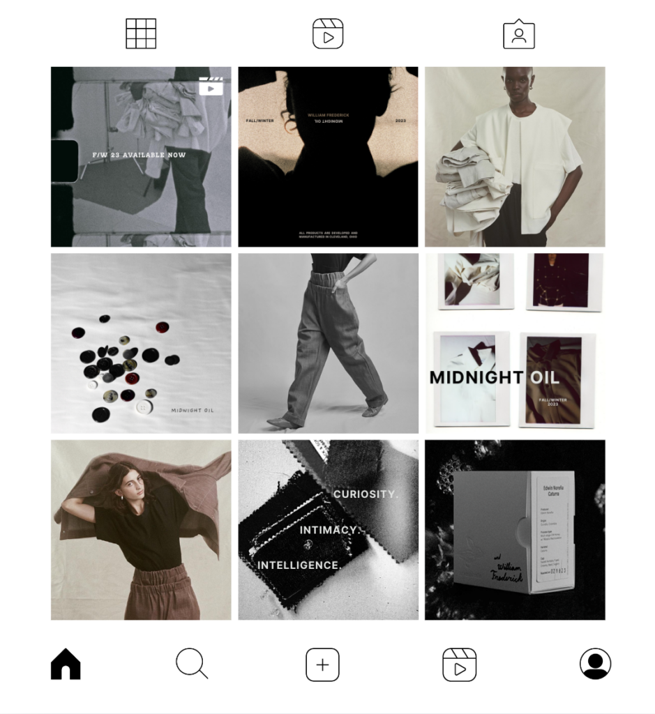 The content featured on William Frederick’s Instagram is art and design-based. It typically features film photography of both clothing and related lifestyle content with a muted color scheme. This grid features e-commerce images, promotional videos, and graphics that elevate their casual post style.