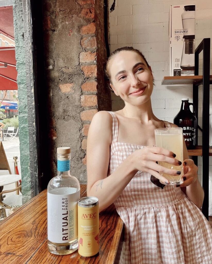 Elizabeth uses a variety of brands like Ritual, Surely, Pathfinder, Goldies, Flyers Cocktails, Mingle Mocktails, Avec, and more to create mocktails. Mocktail is a term for a zero-proof cocktail. She also serves non-alcoholic beer and wine. She features a non-alcoholic whiskey cocktail, a summer foamy cocktail that almost looks like a beer, and a delicious replica of a spicy margarita. She actually collaborated with Kobrick Coffee Co. on a non-alcoholic expresso martini, which she described as one of her favorites.